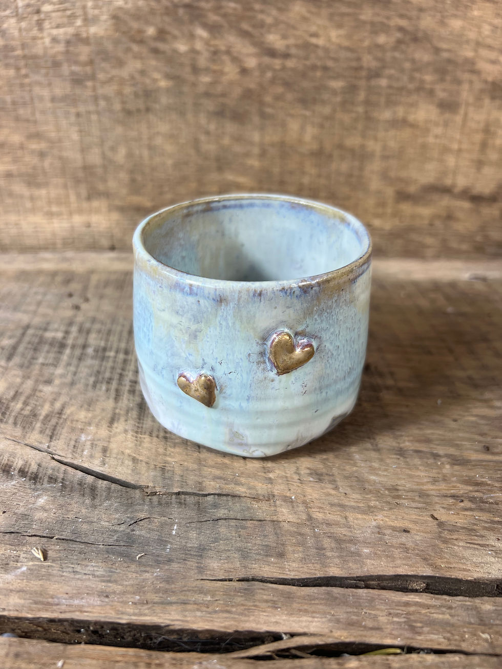 Petite Tasse sans anse en grès – émail rose et cœur doré